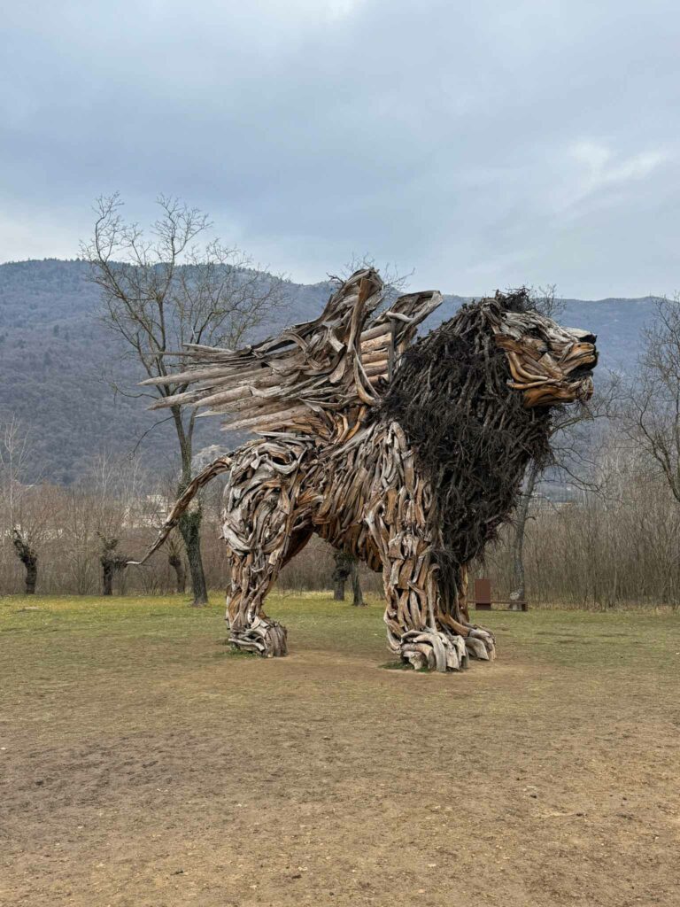 IIl Leone Alato di Marco Martalar è una grandiosa installazione di land art che sorge in località Fratta di Tarzo, affacciata sul lago di Revine, nel comprensorio delle coline del Prosecco. L’opera è stata inaugurata nell’agosto 2025, in concomitanza con il sesto anniversario del riconoscimento UNESCO delle Colline del Prosecco di Conegliano e Valdobbiadene, ed è considerata il più grande leone ligneo al mondo, con misure di circa sette metri in altezza e dieci in lunghezza.