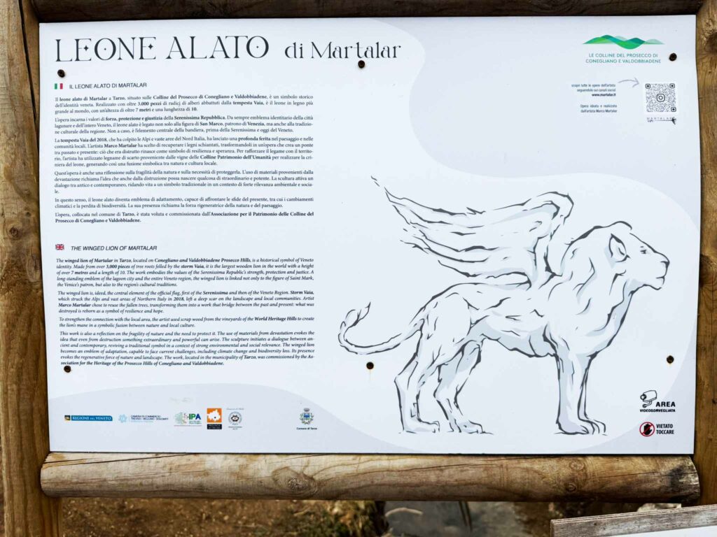 Il Leone Alato richiama il simbolo della Serenissima Repubblica di Venezia e ne incarna i valori di vigore, tutela e giustizia, affermandosi come un nuovo emblema dell’identità veneta contemporanea. L’opera è facilmente raggiungibile con una breve camminata dal parcheggio situato in località Fratta di Tarzo, lungo un percorso accessibile anche con passeggini, e si inserisce armoniosamente nel paesaggio delle Colline del Prosecco di Conegliano e Valdobbiadene, riconosciute come patrimonio mondiale.